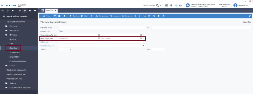 Αν τρέξετε την εργασία Παρτίδες, από την ομάδα Πίνακες ειδών/πελατών και επιλέξετε Ημερ. λήξης, σας εμφανίζει τη λίστα με τα σκευάσματα που λήγουν μέσα στο ημερολογιακό διάστημα που έχετε επιλέξει.