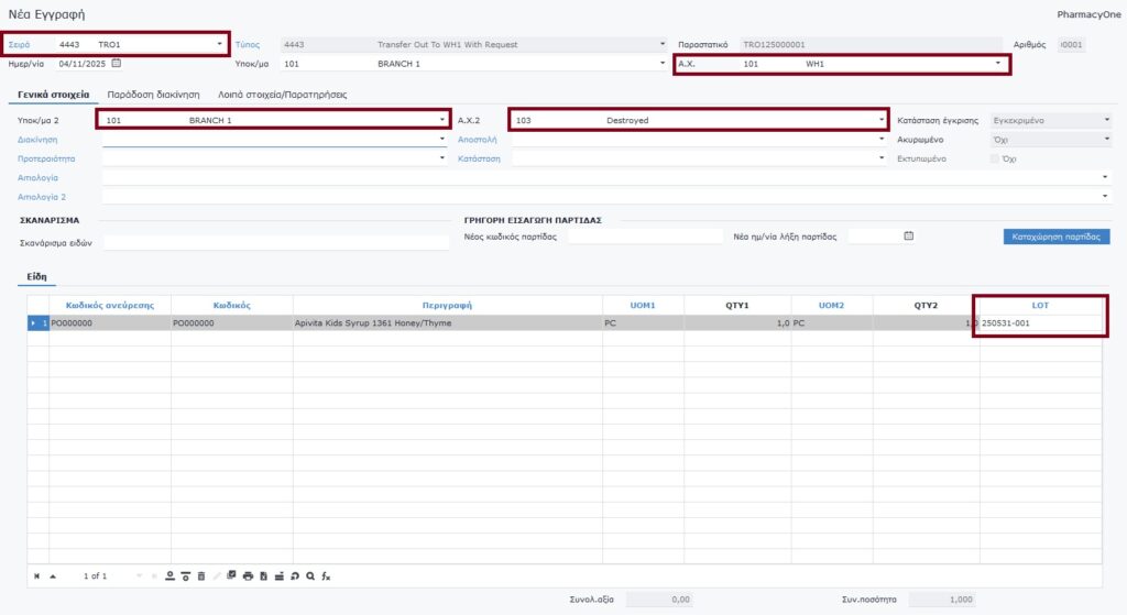 Επιλέγετε τον Α.Χ. από τον οποίο θα φύγει το απόθεμα. Στο πεδίο Υποκ/μα 2 επιλέγετε την εταιρεία στην οποία θα πάει και στο πεδίο Α.Χ. 2 τον αποθηκευτικό χώρο Destroyed.